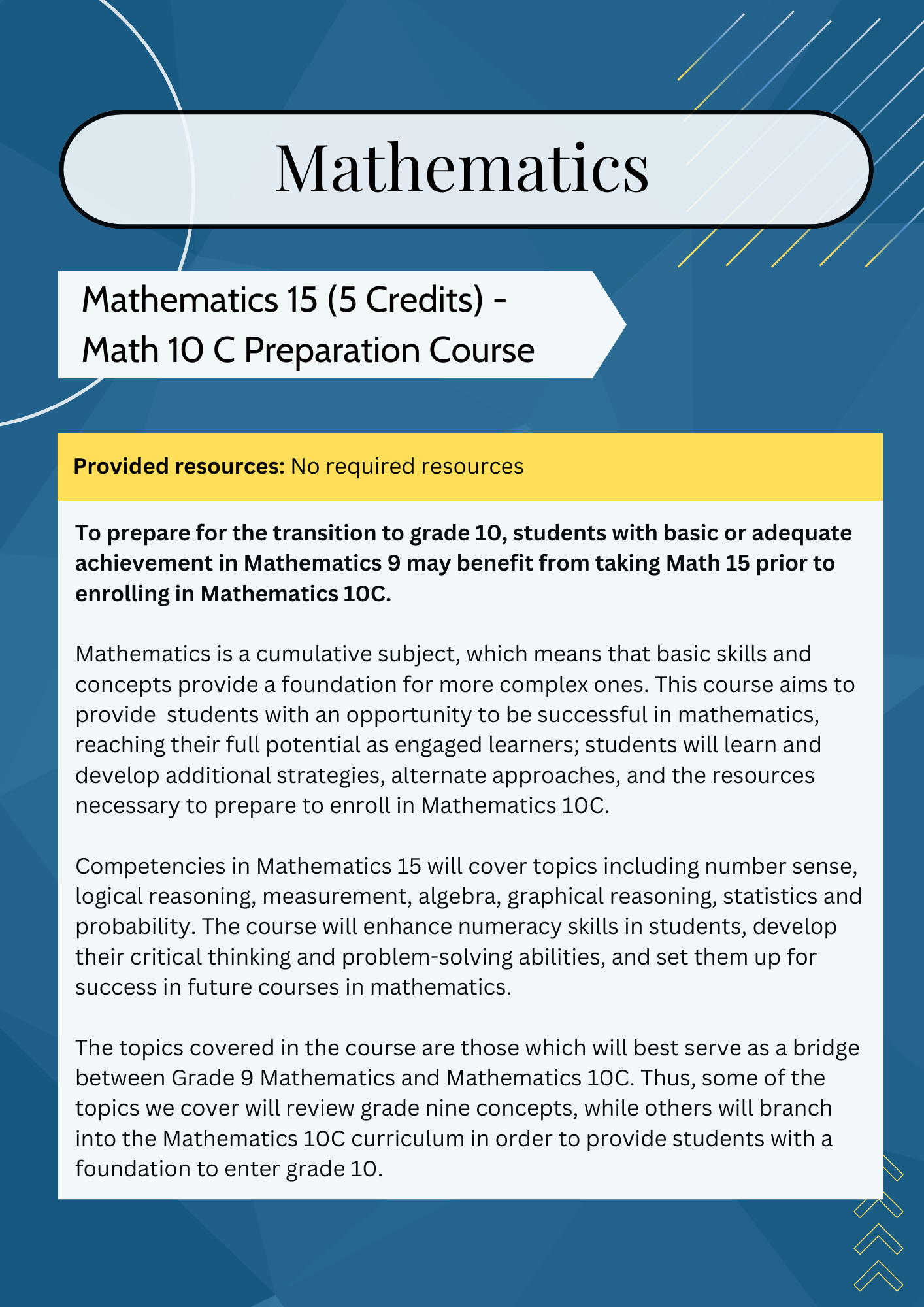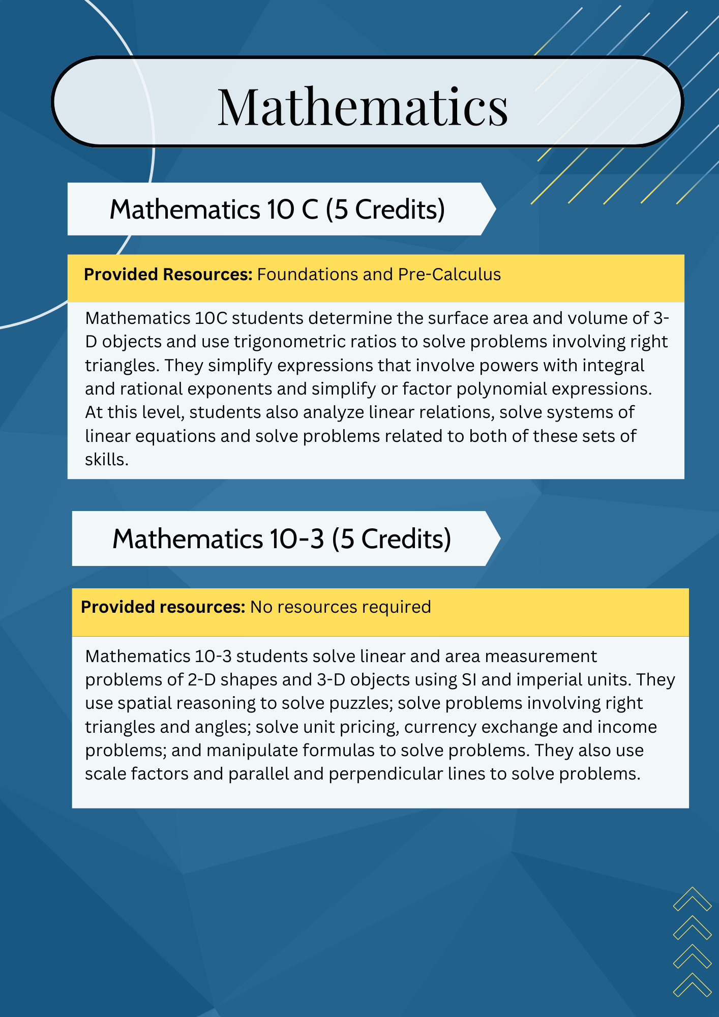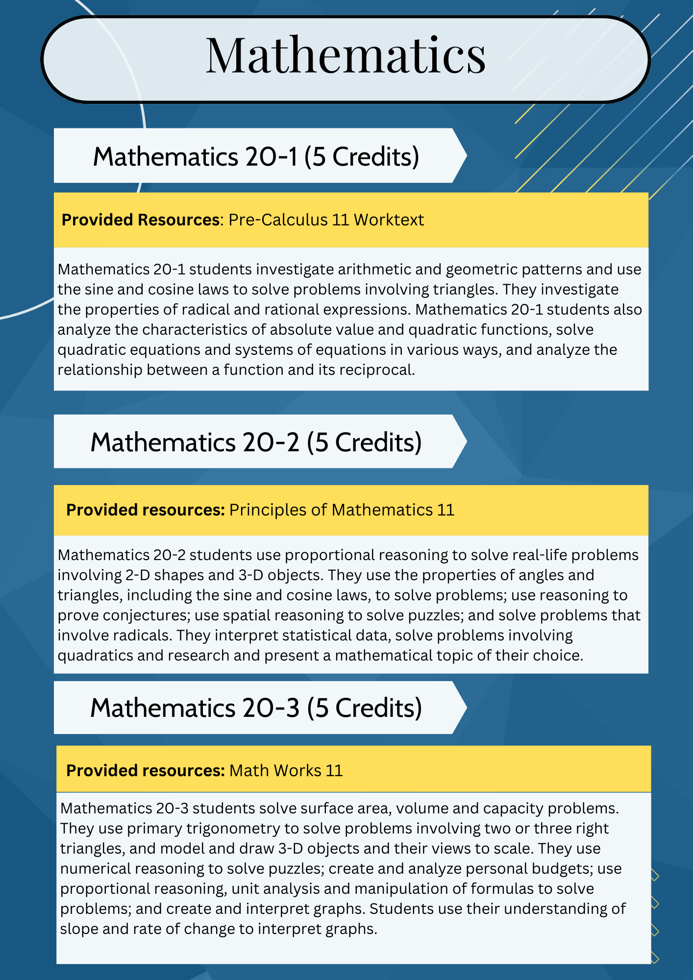 | Math 20-1 | Math 20-2 | Math 20-3 | Math 30-3 | |